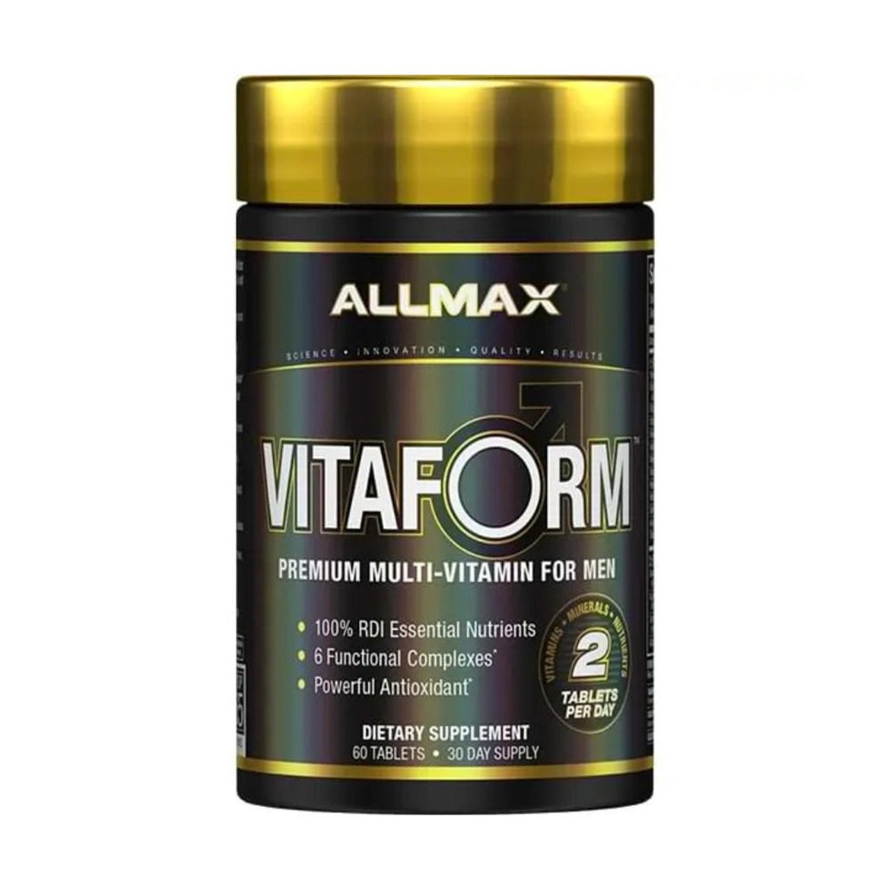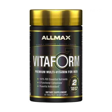 From Allmax Nutrition, one of the leading brands in the fitness industry, comes a powerful complete multivitamin formulated specifically for active men: Vitaform. With just two capsules a day you can get all of your body’s required nutritional needs, complete with a stellar ingredients list designed to support your fitness goals in addition to your overall health. Vitaform uses 6 ingredient complexes to deliver 100% of your RDI (recommended daily intake) nutrients as well as everything else you need to perform at your best. The VITAPLEX complex consists of all the essential vitamins your body needs to function, plus two bioavailable forms of Vitamin C. The second complex, VIRIMAX, was designed specifically to meet the nutritional needs of an active man while the third complex, POWER, provides you with key anti-oxidants to protect your cells from oxidative damage that can occur from intense exercise. The fourth complex, COGNIFORCE uses natural focus support ingredients to improve your cognitive function while reducing anxiety and stress, so you can stay focused all day long. Finally, the MULTIFLEX complex provides support for your bones and joints while the sixth complex, ELECTROMAX, ensures that your electrolytes remain balanced for optimal athletic performance. If you are a male athlete, chances are you aren’t fueling your body with everything it needs – even if you have a perfect diet. Plus, like all Allmax products, Vitaform is produced in a cGMP facility and is put through a rigorous 5-stage quality control process to ensure that you are getting only the finest and most effective ingredients. Order your bottle of Allmax Nutrition’s Vitaform Men’s Multivitamin and start fueling your body!