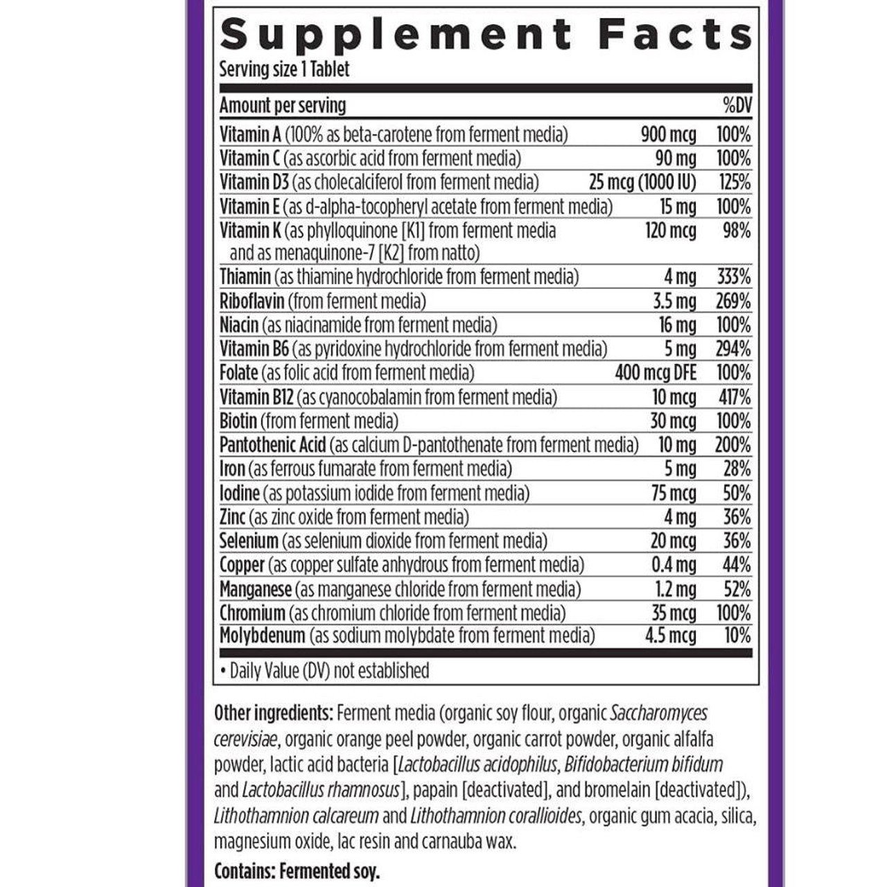The one daily multivitamin includes a fermented formula including probiotics and whole foods.